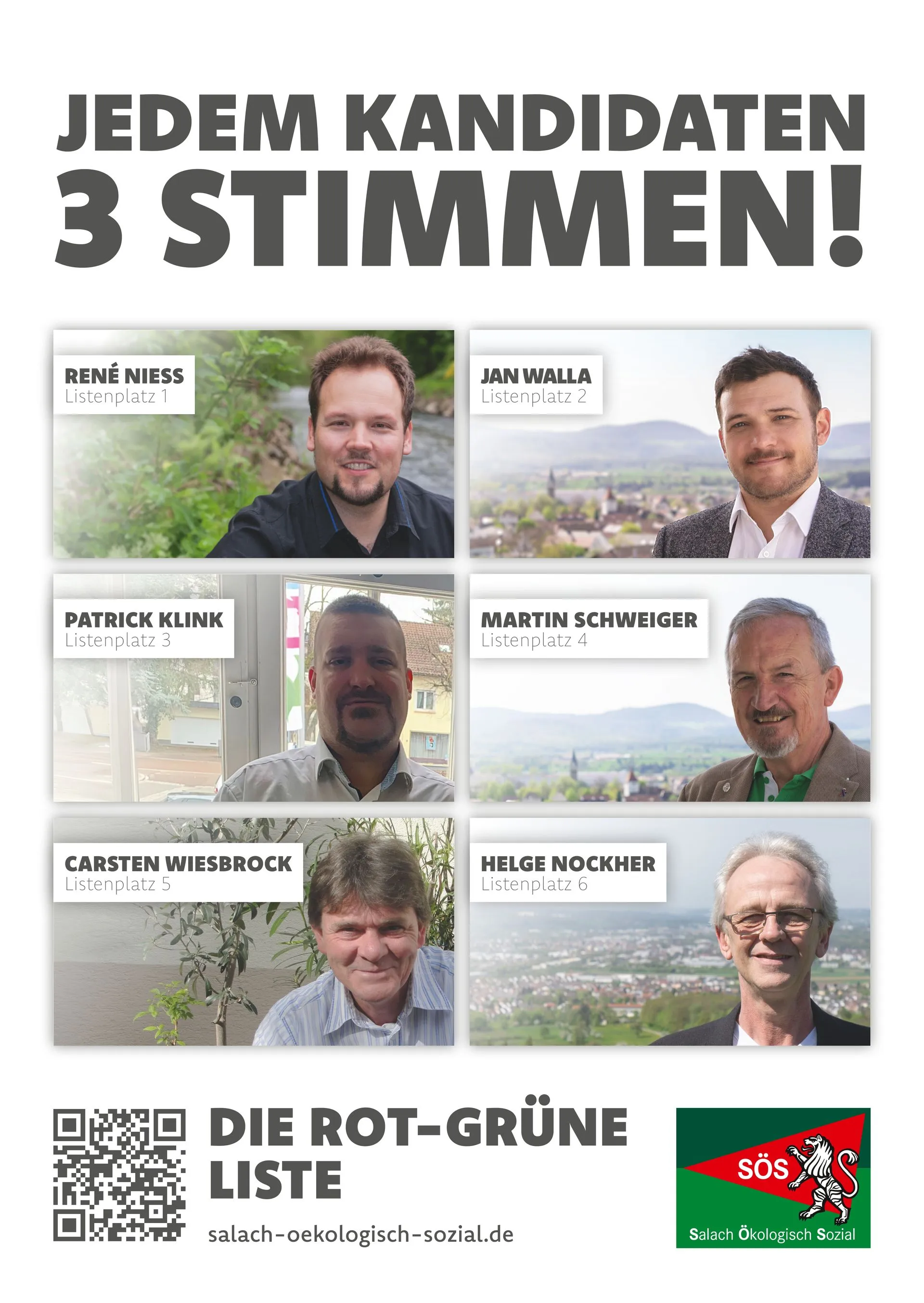 Mit dem Slogan „für Sie, für Salach“ trat SÖS bei der Kommunalwahl 2024 als sozial-ökologisches Korrektiv im Salacher Gemeinderat zur Wiederwahl an.